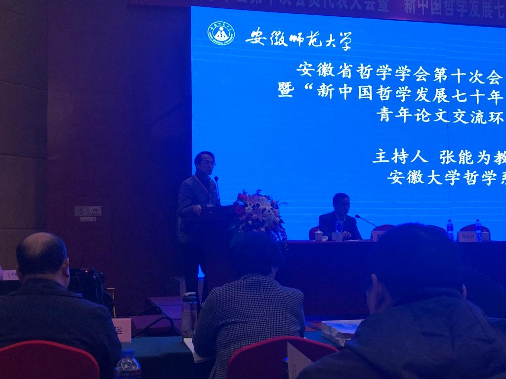 本次哲学学会的研讨主题是“新中国哲学发展七十年”,与会学者围绕马克思主义哲学成就与中国社会发展、中国哲学发展与传统文化复兴、西方哲学传播与当代中国社会思潮、新中国哲学发展前沿问题与思考、哲学创新与“五大美好安徽”建设等问题开展了深入的交流。方政、钱善刚、周莉提交了与会议主题相关的论文,被安徽省哲学学会收入会议论文集,并且在本次学术论坛中做了主题发言,积极与参会学者进行了广泛的交流和沟通。