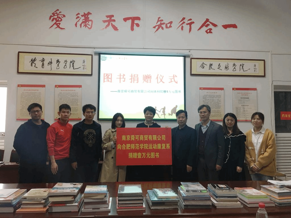 院党总支副书记王飞对南京舜可商贸有限公司的到来表示欢迎,对学院运动康复专业建设的支持表示的感谢,并简单介绍了运动康复专业建设的基本情况。孙健总经理对我院运动康复专业的发展给予肯定,向运动康复系捐赠了价值一万元的图书,并表示助学兴教、服务社会是企业义不容辞的责任,希望以本次捐赠图书为契机,加强与体育科学学院的交流合作,做好慈善助学活动,为学校人才培养、科学研究,为建设地方应用型高水平大学贡献力量。
