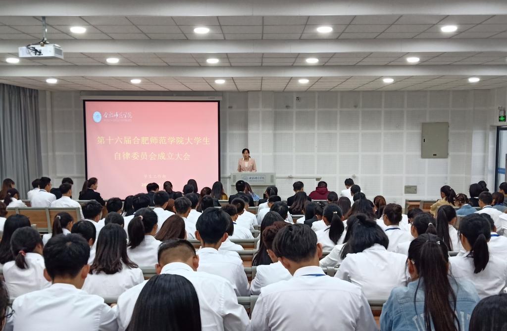 本网讯 10月27日上午,第十六届大学生自律委员会成立仪式在滨湖校区博学楼A108教室举行。学生工作部副部长刘艳,学生工作部老师葛畅、赵峰参加仪式,第十六届大学生自律委员会全体成员参加会议。大会由第十六届大学生自律委员会学风建设部部长邬法辉主持。