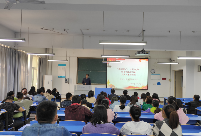 本网讯 10月17日,经济与管理学院“不忘初心、牢记使命”学生预备党员和发展对象培训班开班典礼及第一次专题讲座在逸夫楼A107举行。经济与管理学院党总支书记沈辉、学生党支部书记、锦绣校区67名发展对象和预备党员参加本次开班典礼。