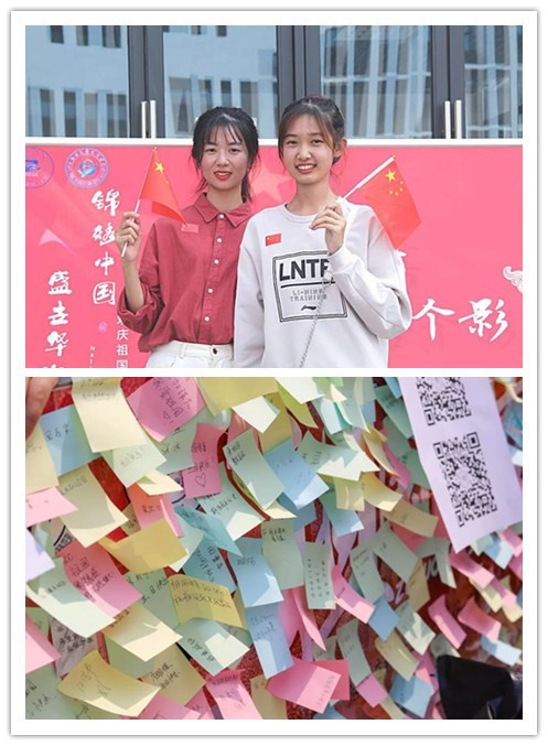 上午十点,滨湖校区同学们在展台前有序排队,工作人员分发小红旗,同学们笑容灿烂,以积极向上的精神面貌留下了与国旗的合影。锦绣校区参与活动的同学在竹园广场用便利贴写下了对于新中国成立70周年来取得的伟大成就的感受,以及对于祖国发展的美好祝福。下午五点,活动圆满结束。