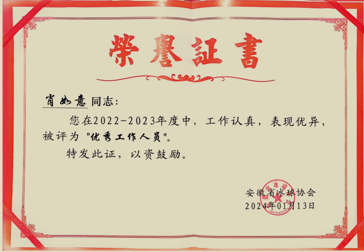 会议还对2023年度为安徽省冰球事业做出突出贡献和成绩的单位及个人进行了表彰,我院体育科学学院肖如意老师获评安徽省冰球协会“优秀工作人员”,388vip太阳集团获评安徽省冰球项目“优秀组织单位”。