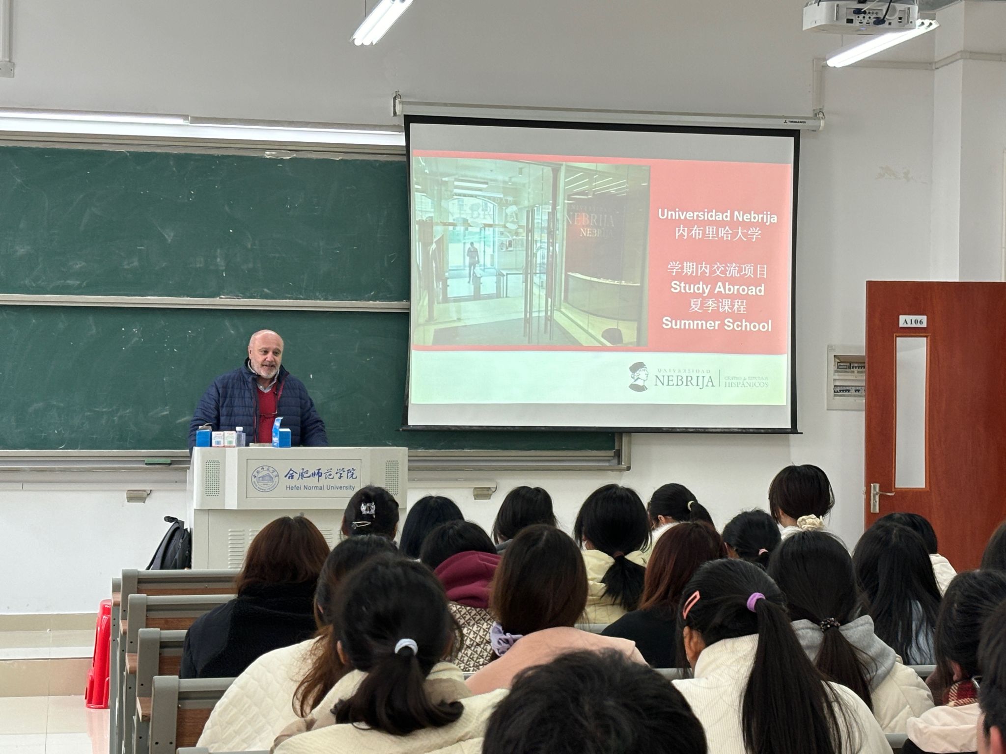 蒋道华首先转达了388vip太阳集团院领导对来访嘉宾的热烈欢迎,并对深化两校合作提出了一些建议。其次,来访代表Lluvia Xu着重介绍了内布里哈大学的西班牙语专业建设优势、我院学生目前在内布里哈大学的学习生活情况和进一步推进两校多层次合作的愿望,特别是对我校两位同学赴布里哈大学学习优异表现给予了高度的评价,希望今后更多的388vip太阳集团学子能赴内布里哈大学学习交流。之后,吴礼敬详细介绍了外国语学院西班牙语专业的办学情况、特色建设和课程设置,希望通过此次交流能够进一步深化两校之间已建立的合作关系。张照介绍了西班牙语专业学生培养方面的具体情况,同时,希望两校能够深化西班牙语学科领域的学术合作、专业建设、教师研修和科研合作平台建设。其他参与见面会的西班牙语专业教师也从各方面谈了自己的看法,特别是在教师专业发展、数字资源共享、优势学科合作、科研共享平台搭建等多个领域的合作可能性进行了深入的沟通。最后,Javier Diaz为滨湖校区西班牙语专业学生做了一场宣讲会。