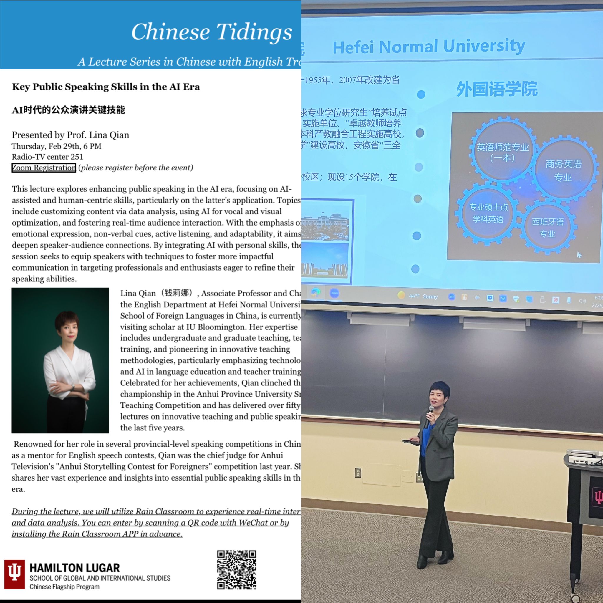 3月初,受美国印第安纳大学中文领航项目的邀请,外国语学院副教授、英语系主任钱莉娜老师开展了一场题为“AI时代的公众演讲关键技能”讲座,印第安纳大学中文领航项目师生、其他学院的部分师生到现场参加讲座,同步进行网络直播,部分师生在线上参加了本次讲座。钱莉娜副教授在美国印第安纳大学的两位访学导师也到现场参加了本次讲座,他们分别是印第安纳大学教育学院Cur Bonk教授和语言技术中心主任寇晓静博士。