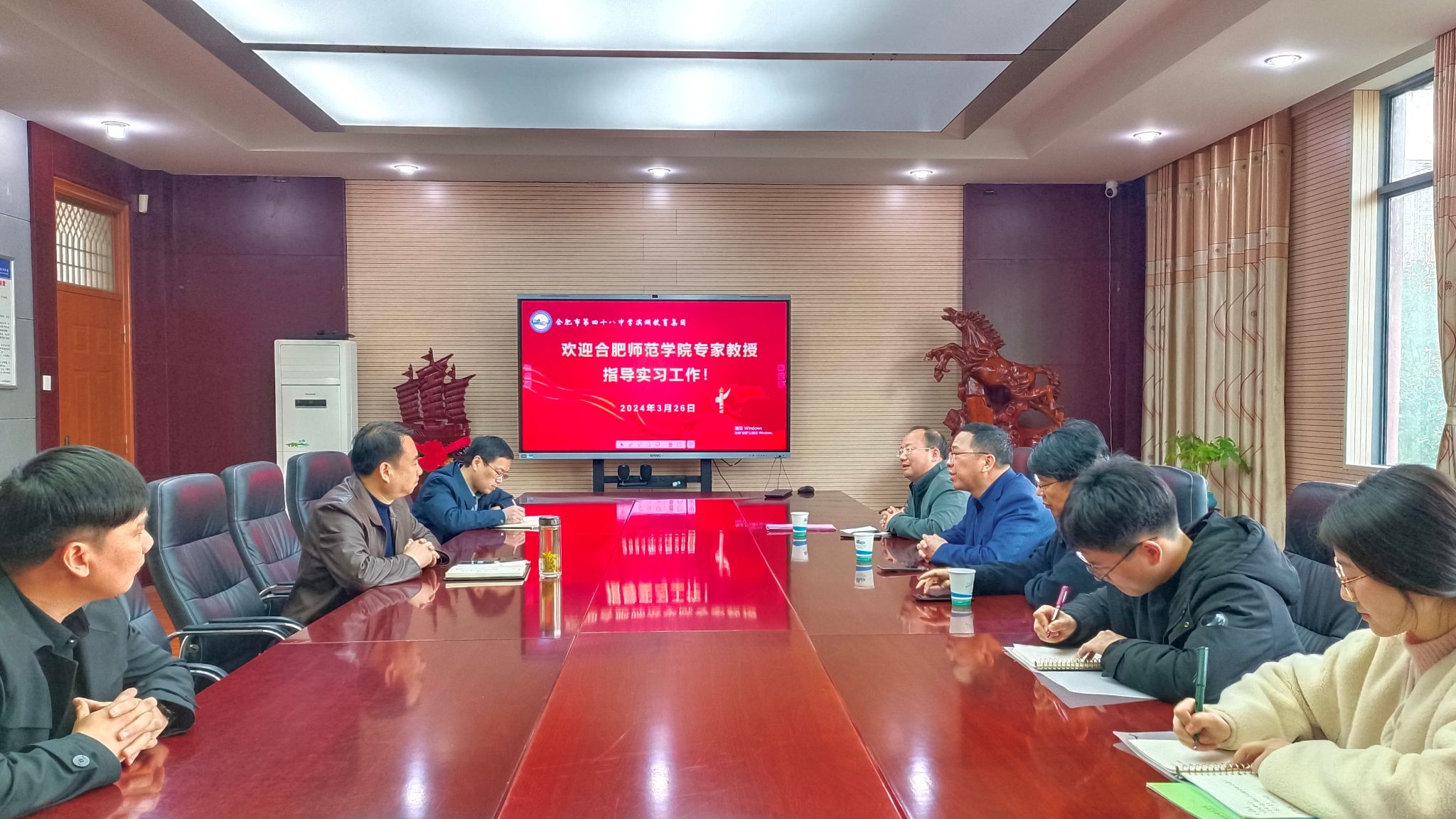 随后到合肥市四十八中滨湖教育集团,该校校长张伟热情接待文学院一行,并举行实践教育基地牌仪式。双方还就 “经典悦读与文化传承”实践基地建设进行座谈交流并达成初步合作意向。会上,何旺生代表文学院希望以此次签约挂牌为契机,做深做实做出文化教育合作品牌,打造优质教育实践基地,为基础教育共育卓越师资。