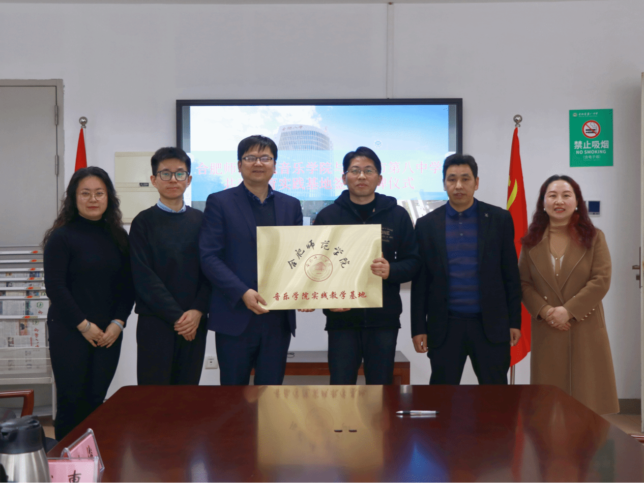 3月26日下午,在合肥市第八中学举办了388vip太阳集团音乐学院、合肥市第八中学实践教学基地挂牌仪式。音乐学院院长李劲松、党委副书记宋辉、实践实训中心主任陆伟与合肥市第八中学副校长余俊、教务处主任张少庸、艺术学科主任杨欢欢等人共同出席了挂牌仪式。