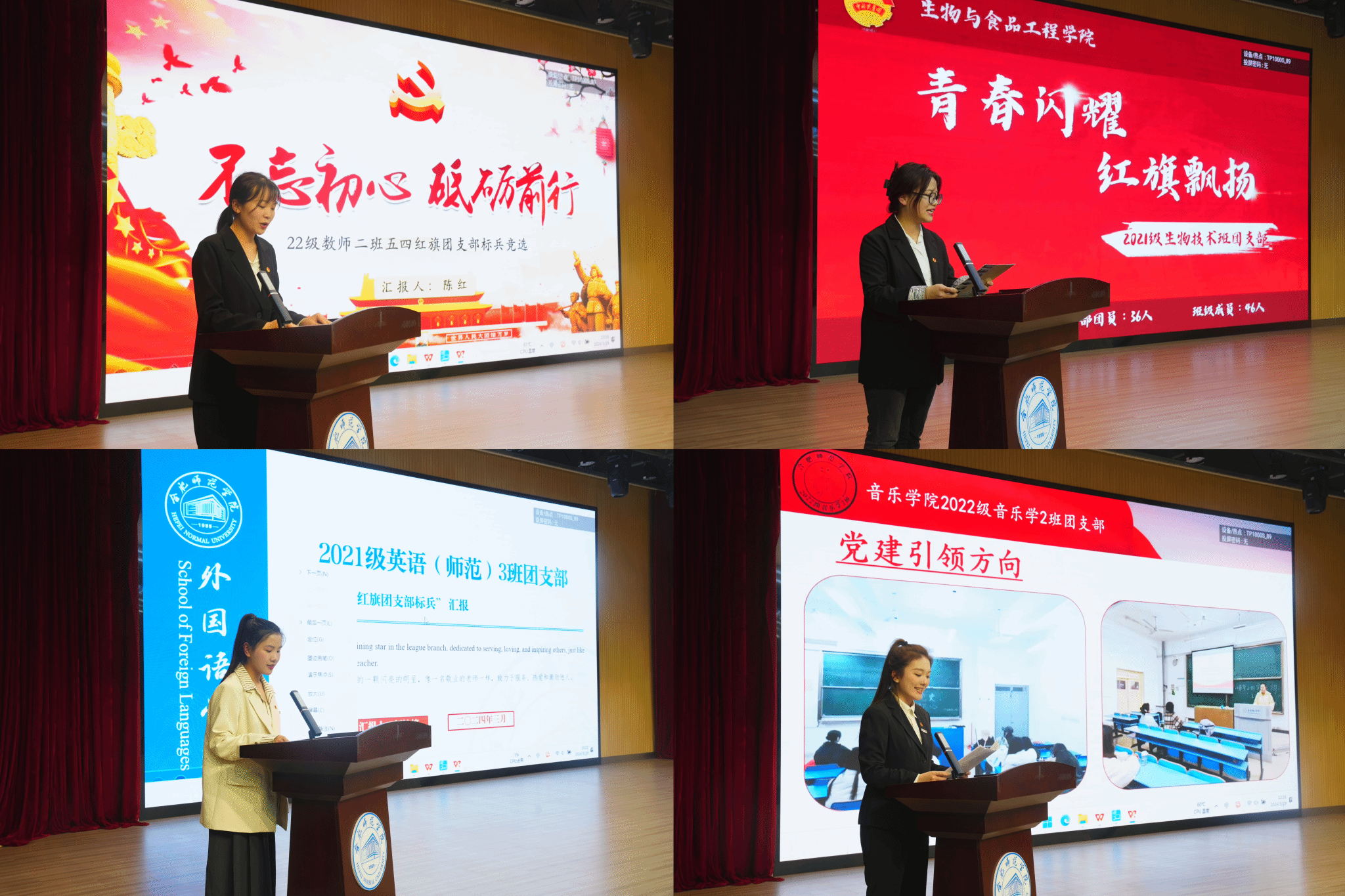 经各二级学院团委选拔推荐,14支优秀团支部参加现场汇报评选。各团支部聚焦团组织的组织力、引领力、服务力和贡献度的发挥,围绕共青团重点工作,分别从政治能力、组织基础、联系服务、作用发挥四个方面作汇报展示,总结回顾了过去一年参评团支部的工作成效和工作特色,重点汇报了团支部政治理论学习、班团一体化建设、“三会两制一课”制度落实、“第二课堂”活动开展、团员教育培养等工作开展情况。