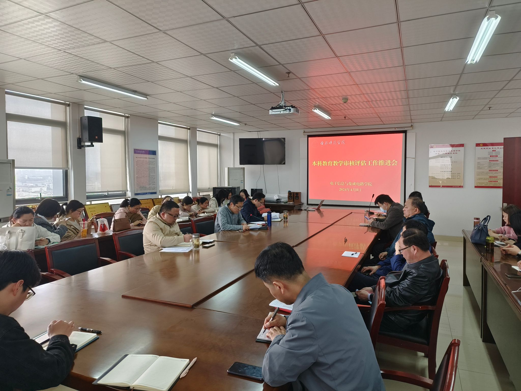4月10日下午,电子信息与集成电路学院在行知楼1210会议室召开本科教育教学审核评估工作推进会,学院党政班子成员、系部主任、党支部书记以及全体教职工参加会议,会议由党委副书记、院长张忠祥主持。