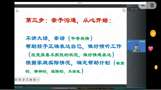 王世民教授从在校大学生呈现的学习无动力、对真实世界无兴趣、社交无能力以及对生命价值无感受的“四无”现状入手,探讨了后疫情时代大学生心理健康面临困境,特别是普遍出现的社交焦虑、就业和职业发展困境。随后,就家长如何应对大学生面临的困境,提出了亲子沟通三点建议:一是重新开始了解孩子;二是立足实际,贴近孩子;三是亲子沟通,从心开始,并强调了“爱是赋能,不是负担”的重要理念。最后,结合“非暴力沟通四步法”和“爱的五种语言”,向听众传授亲子沟通“不吼不叫的沟通技术”。讲座现场,氛围热烈,学生及家长认真观看,积极互动。