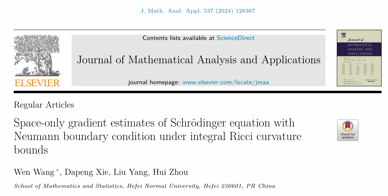 近期,数学与统计学院“基础数学”省级重点学科微分方程与动力系统团队教师王文、解大鹏、杨刘、周辉在几何偏微分方程方向取得进展,相关成果Space-only gradient estimates of Schr?dinger equation with Neumann boundary condition under integral Ricci curvature bounds在JCR二区期刊《Journal of Mathematical Analysis and Applications》公开发表。