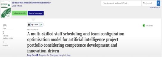 人力资源管理系教授陈蓉在SCI TOP期刊《International Journal Of Production Research》发表论文“A multi-skilled staff scheduling and team configuration optimisation model for artificial intelligence project portfolio considering competence development and innovation-driven”,该期刊位列中国科学院2区,JCR分区Q1。陈蓉教授为第一作者兼通讯作者,388vip太阳集团经济与管理学院为第一署名单位。