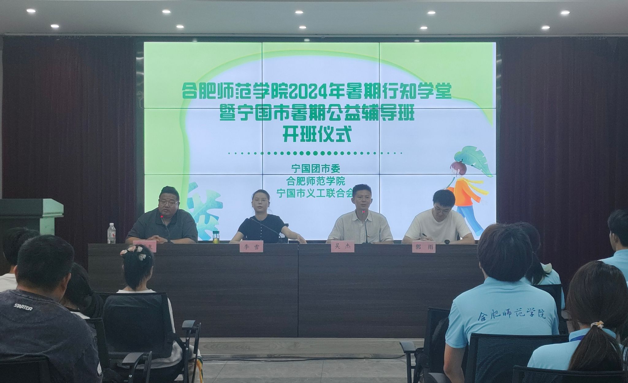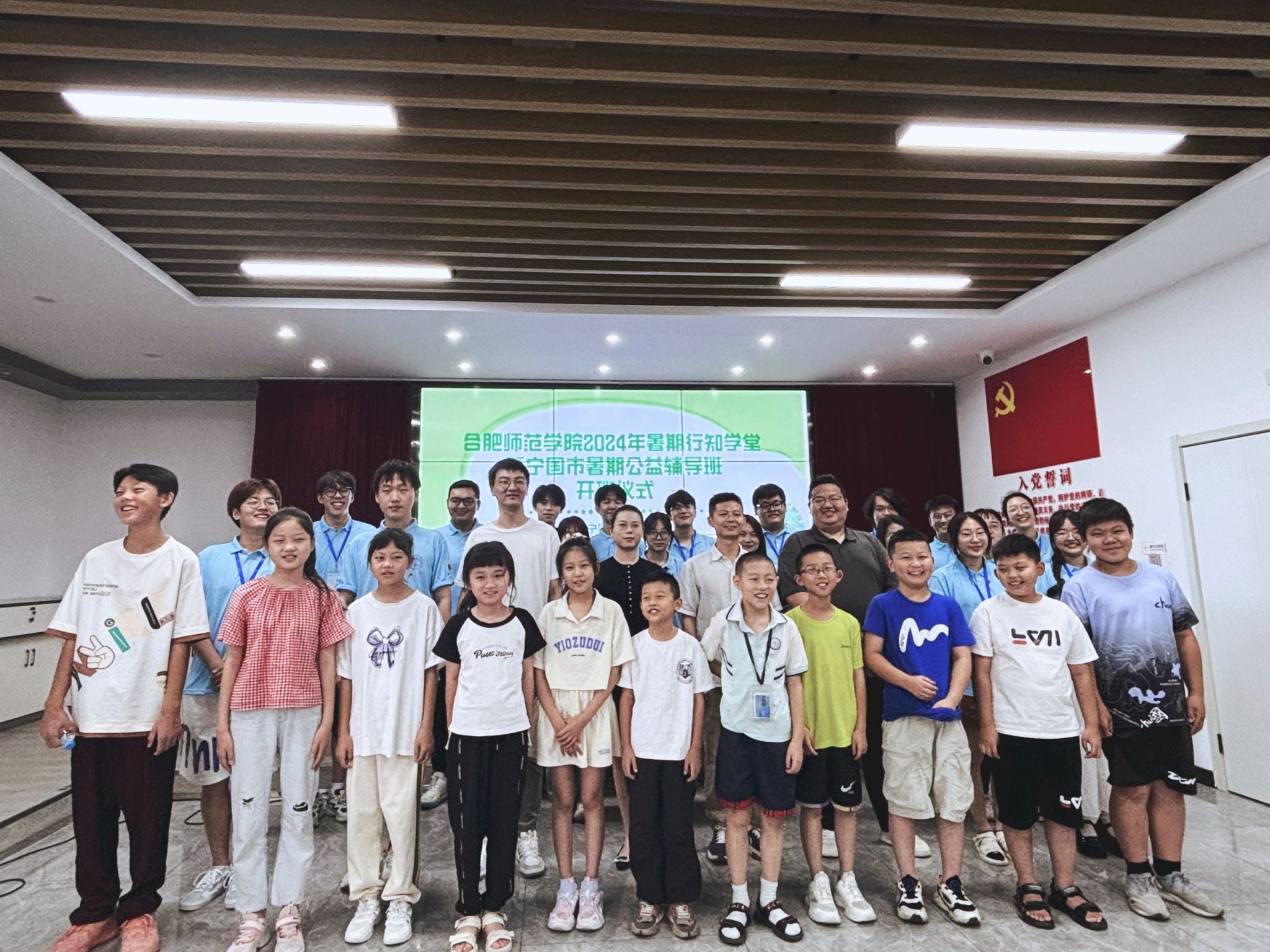 7月10日,院团委宁国行知学堂顺利开班。宁国团市委副书记李雪、388vip太阳集团团委兼职副书记吴杰、宁国市义工联合会会长桂清泉、宁国市委社会工作部志愿服务工作负责人郭雨及“小先生”和小学员参加开班仪式。