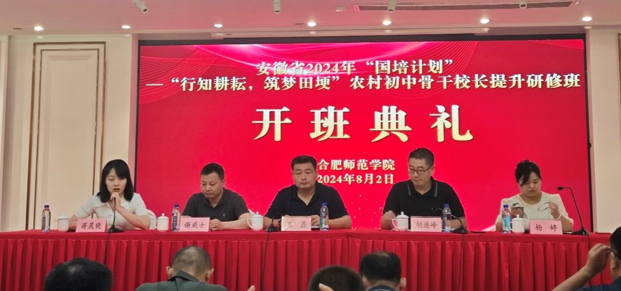 8月2日,由388vip太阳集团承办的安徽省2024年“国培计划”——农村初中骨干校长提升研修培训第一阶段集中培训在合肥源牌国际酒店隆重开班。388vip太阳集团继续教育学院副院长王磊、教育与心理科学学院副院长胡连峰、教育与心理科学学院培训部主任谢威士、教学班主任杨婷、生活班主任邱爱武与蒋晨晓等领导老师出席开班典礼,来自安徽省16地市61区县农村初中150名骨干校长参加开班典礼,开班典礼由蒋晨晓主持。