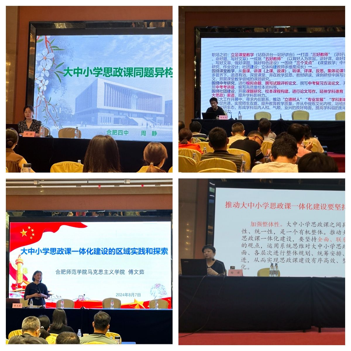 安徽省大中小学思政课一体化建设专家指导组组长刘新跃介绍了大中小学思想政治教育一体化建设的历史、安徽省建设现状与未来展望。合肥市名师工作室领衔人杨使兵结合自己的成长经历,强调了教研赋能教师专业化发展的重要性。合肥市第四中学政治学科主任周静从理论和实践两个角度诠释了思政课“同题异构”教学设计。上海师范大学马克思主义学院思政教师教育教研室主任刘建良给大家带来了大中小学思政教育一体化建设的上海实践经验。合肥市梦园小学教育集团校长邵春荣结合自身经历介绍了中小学教师如何做好课题研究。庐江县教育体育局教研员陶佳总结了庐江县近几年来在中小学思政课一体化建设的生动实践经验,强调要坚持系统思维来指导庐江县的继续探索工作。我校马克思主义学院朱玉利和傅文茹两位专家,分别围绕弘扬“教育家精神”与合肥市一体化建设成果做了专题报告,并得到参训学员的好评。