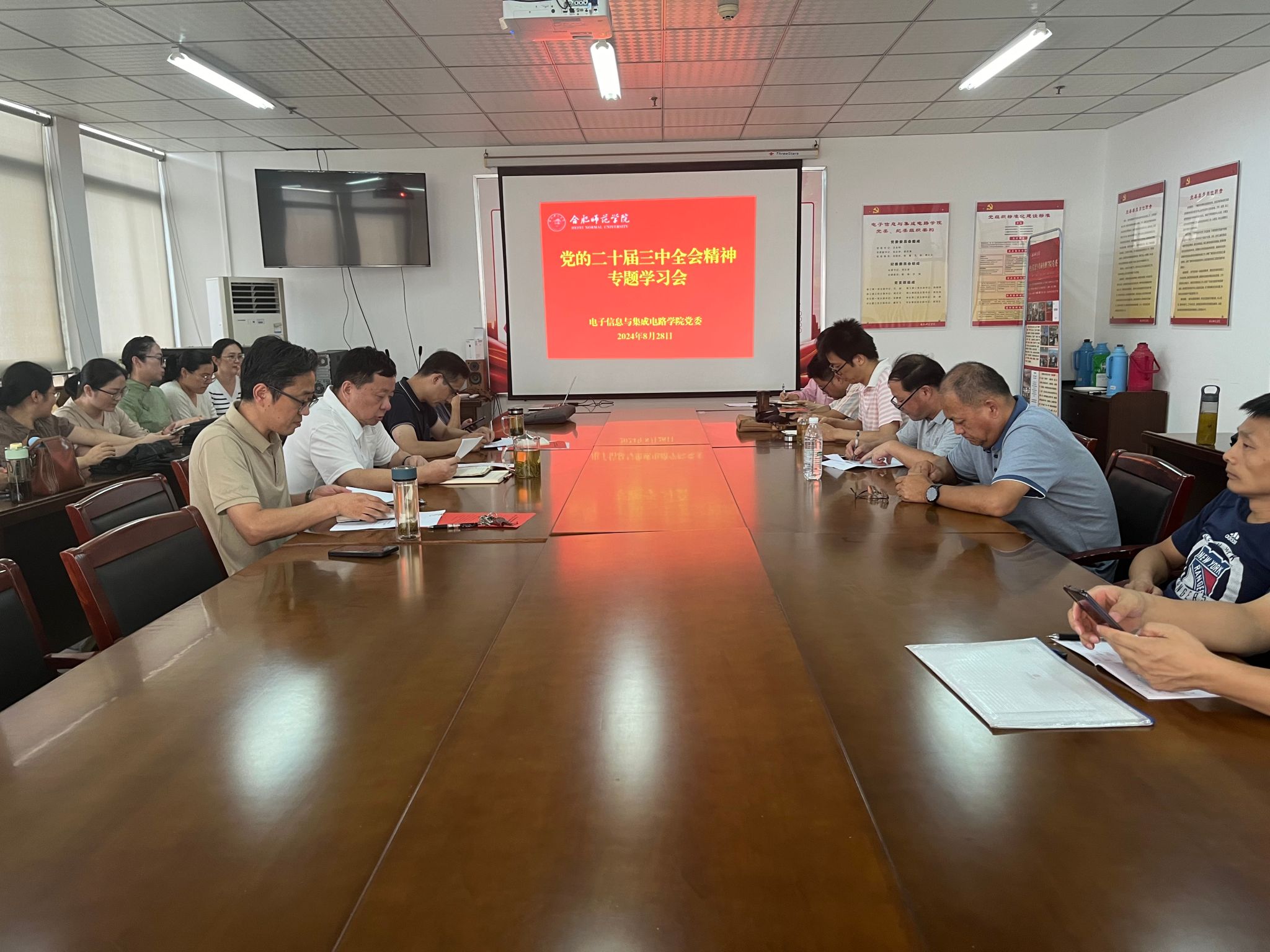 为深入学习宣传贯彻党的二十届三中全会精神,准确把握全面深化改革的总体要求,进一步统一思想、凝聚共识,8月28日下午,电子信息与集成电路学院党委在知行楼1210会议室召开党的二十届三中全会精神专题学习会议,学院党政班子、系部主任、支部书记和全体教职工参会,会议由学院党委书记王东明主持。