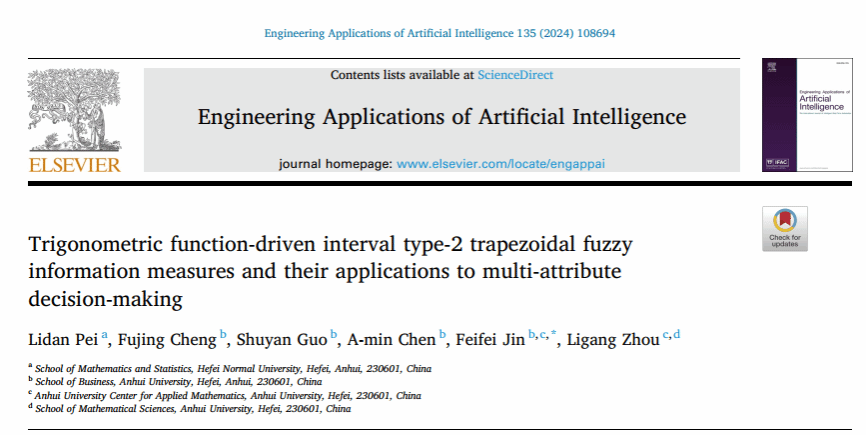 近期,数学与统计学院“基础数学”省级重点学科应用统计与分析团队成员裴利丹在协同决策方向取得进展,相关成果Trigonometric function-driven interval type-2 trapezoidal fuzzy information measures and their applications to multi-attribute decision-making在JCR二区期刊《Engineering Applications of Artificial Intelligence》公开发表。