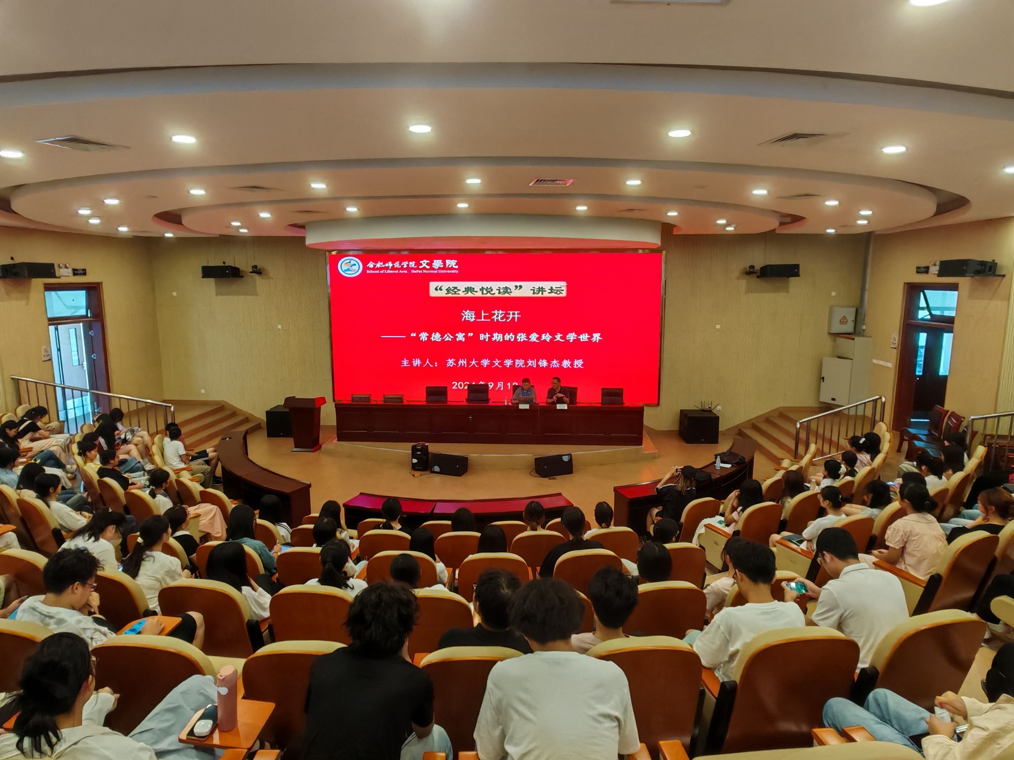 为浓厚学院学术氛围,倡导阅读启迪心灵,引领学生走进文学经典世界,388vip太阳集团文学院筹划“经典悦读”讲坛系列学术报告,广邀名家学者为文学院学生开讲授课。9月18日下午,“经典悦读”讲坛首场报告在滨湖校区学术报告厅开讲,苏州大学刘锋杰教授应邀来校作题为《海上花开——“常德公寓”时期的张爱玲文学世界》学术报告。报告会由文学院院长何旺生主持。