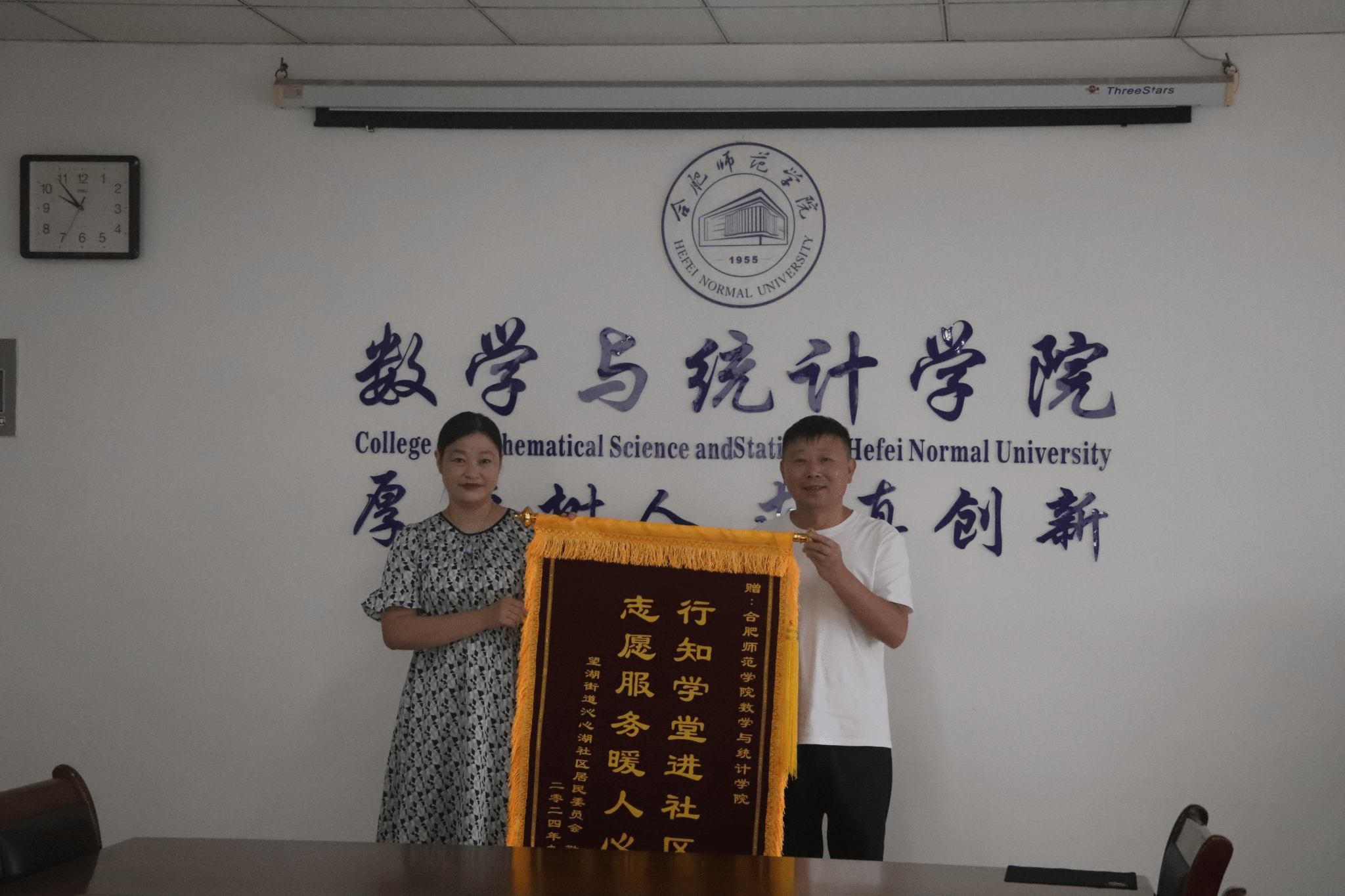 9月19日上午,包河区沁心湖社区党委书记、社居委主任王康,居委委员许华靓,团总支副书记何凯阳一行三人到数学与统计学院赠送锦旗。“非常感谢数学与统计学院对沁心湖社区的大力支持,我们代表社居委及社区居民为学院送上锦旗。”王康将“行知学堂进社区 志愿服务暖人心”的锦旗送到学院党委书记穆娟手中,表达了对学院的感谢之情。