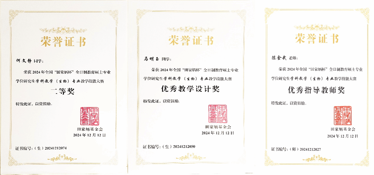 我校学科教学(生物)研究生荣获全国“田家炳杯”教育硕士教学技能大赛二等奖