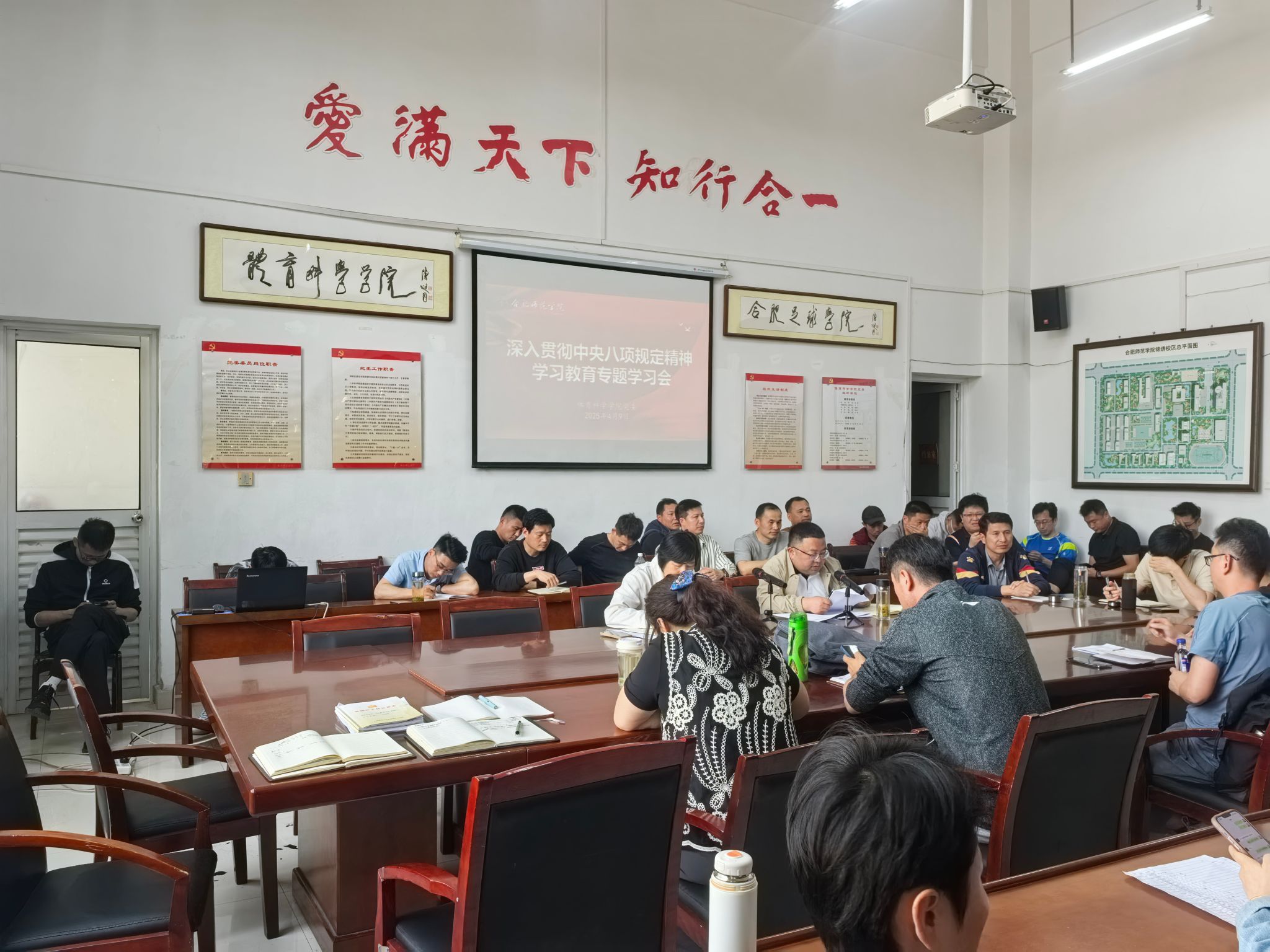 4月9日下午,体育科学学院党委在锦绣校区体育馆会议室召开深入贯彻中央八项规定精神学习教育专题学习会,学院党政班子、系部主任、支部书记及全体教职工参加,会议由学院党委书记胡石清主持。