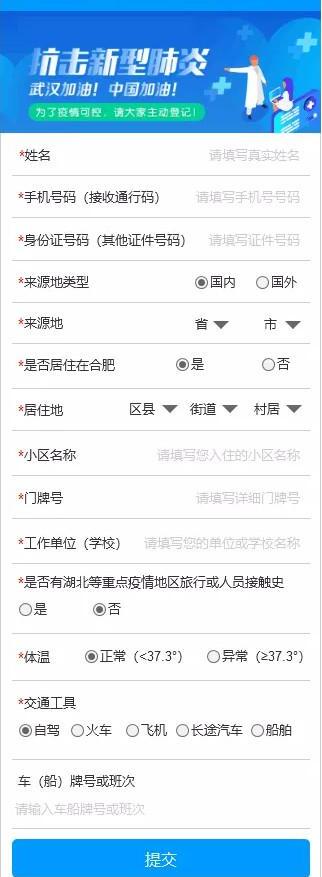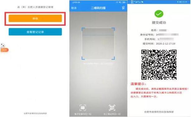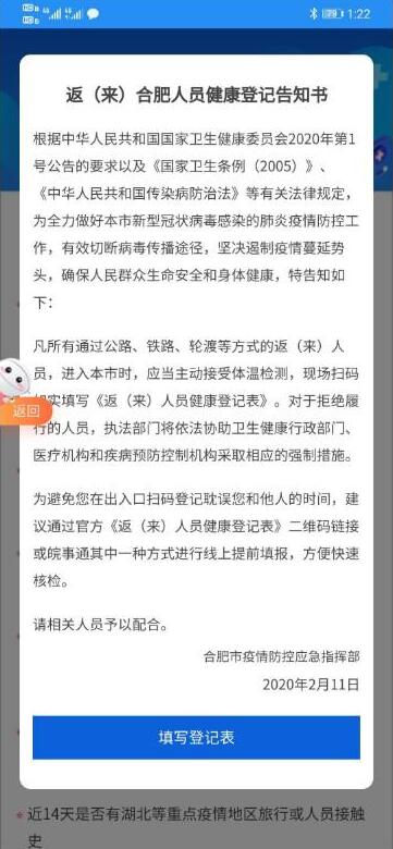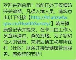 所有经由公路、铁路、航空、水路等方式的返(来)肥人员,进入本市时应主动接受体温检测,如实填写《健康登记表》。为提高通行效率,减少排队等待时间,请近期即将返(来)肥人员,在出发前或途中,提前通过手机网络填报个人健康登记信息(操作说明附后),并保留提交成功后的二维码截图,以备防控人员查验。