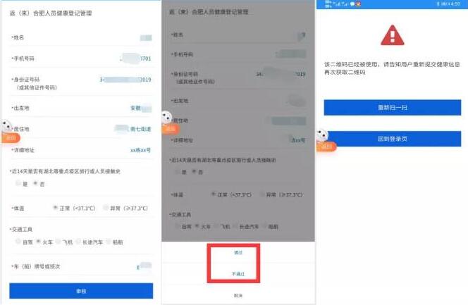 扫描二维码后,核对申请人信息;点击【审核】,根据实际情况点击【通过】或【不通过】。每人每次申请的二维码仅可使用一次,二维码重复扫描将弹出提醒。