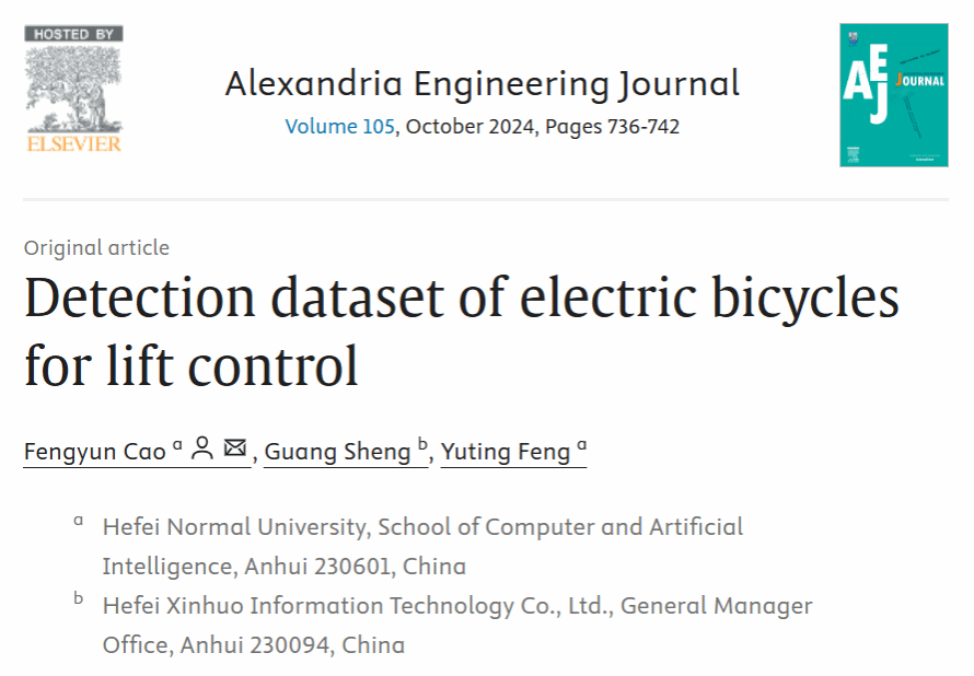 近期,相关成果以“Detection dataset of electric bicycles for lift control”为题被期刊Alexandria Engineering Journal发表(论文引用格式:Fengyun Cao, Guang Sheng, Yuting Feng, Detection dataset of electric bicycles for lift control [J], Alexandria Engineering Journal, Volume 105, 2024, Pages 736-742. )。该期刊为中国科学院二区TOP期刊,影响因子为5.9。388vip太阳集团为该论文的第一单位,计算机与人工智能学院曹风云老师为第一作者、通讯作者。