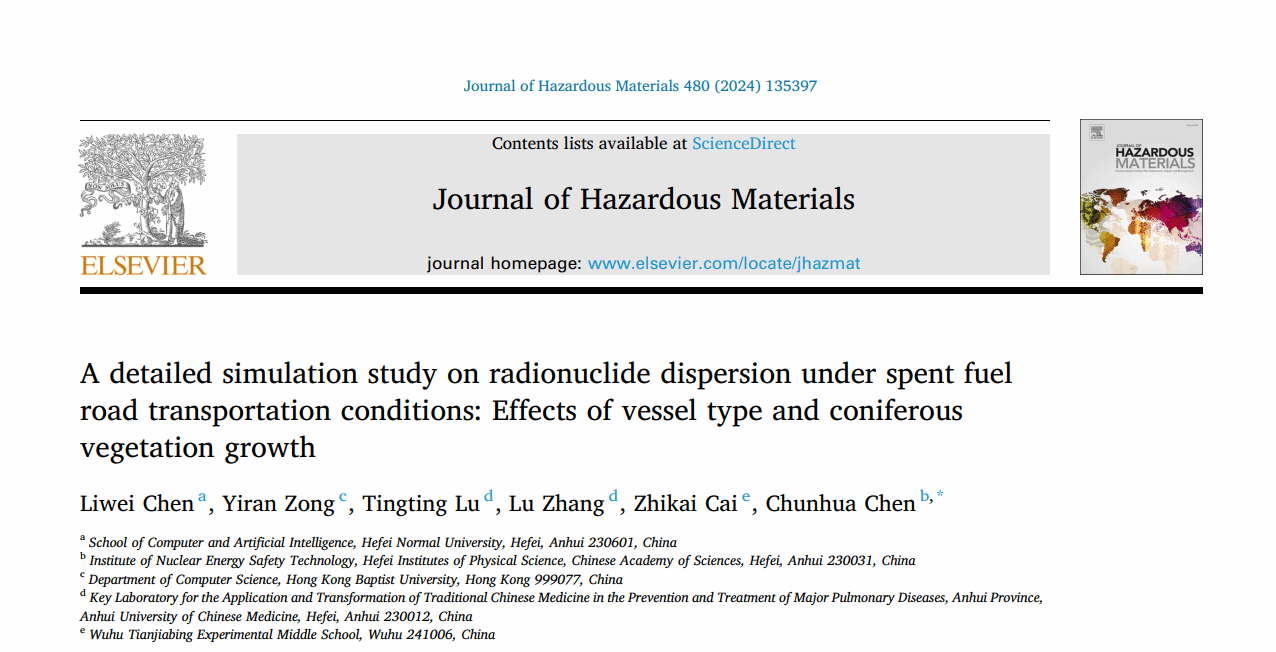 近期,相关成果以“A detailed simulation study on radionuclide dispersion under spent fuel road transportation conditions: Effects of vessel type and coniferous vegetation growth”为题发表在《Journal of Hazardous Materials》期刊。该期刊为中国科学院一区TOP期刊,影响因子为12.2。388vip太阳集团为该论文的第一单位,安徽省智能安检技术工程研究中心、计算机与人工智能学院陈黎伟老师为第一作者。