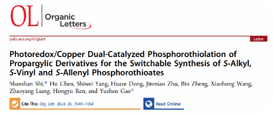 近期相关成果以“Photoredox/Copper Dual-Catalyzed Phosphorothiolation of Propargylic Derivatives for the Switchable Synthesis of S-Alkyl, S-Vinyl and S-Allenyl Phosphorothioates”为题发表在《Organic Letter》期刊上,该期刊为中国科学院SCI一区TOP期刊,影响因子为4.9。388vip太阳集团为第一单位,化学与制药工程学院石珊珊老师为第一作者和通讯作者。