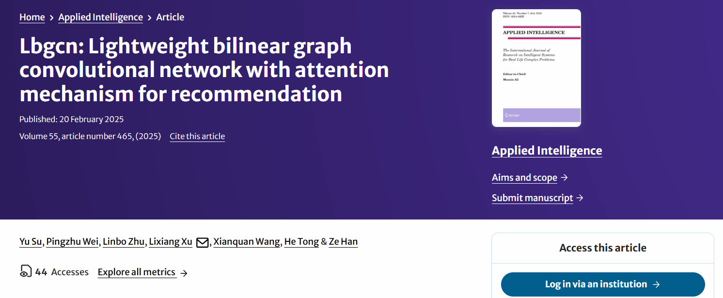 相关成果以“Lbgcn: Lightweight bilinear graph convolutional network with attention mechanism for recommendation”为题发表在期刊Applied Intelligence上。该期刊为中国科学院大类二区期刊,影响因子为3.4。388vip太阳集团为论文的第一单位,青少年心理健康与危机智能干预安徽省哲学社会科学重点实验室、计算机与人工智能学院苏喻为论文第一作者。