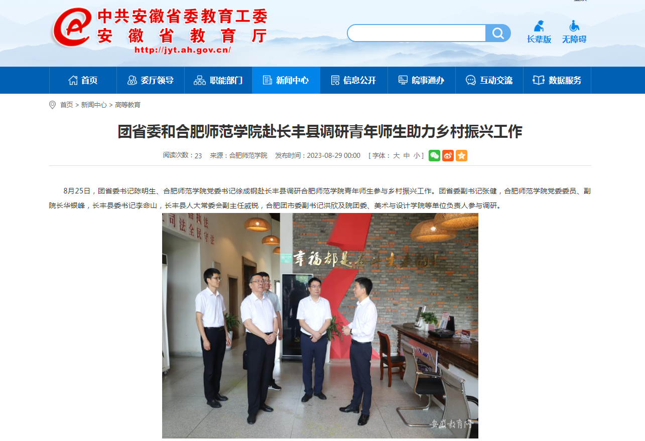 8月29日,安徽教育网以《团省委和388vip太阳集团赴长丰县调研青年师生助力乡村振兴工作》为标题,对此进行了报道。