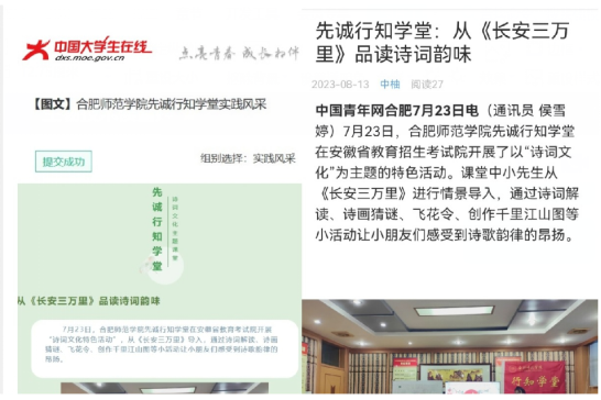 芙蓉社区行知学堂获《中华网》《中青校园》《腾讯新闻》等媒体相继报道17次;谯城区颜集镇李集村“颜”学于心-颜集行知学堂获《中青网》《安徽日报》《安徽检察》等媒体相继报道13次;卫塘社区“风菱少年活动营”行知学堂获《中青校园》《和美望湖》等10家媒体相继报道;阜阳王庄行知学堂获《中青校园》《颍东区共青团》等6家媒体相继报道;先诚行知学堂获《中青校园》《中国大学生在线》等5家媒体相继报道。