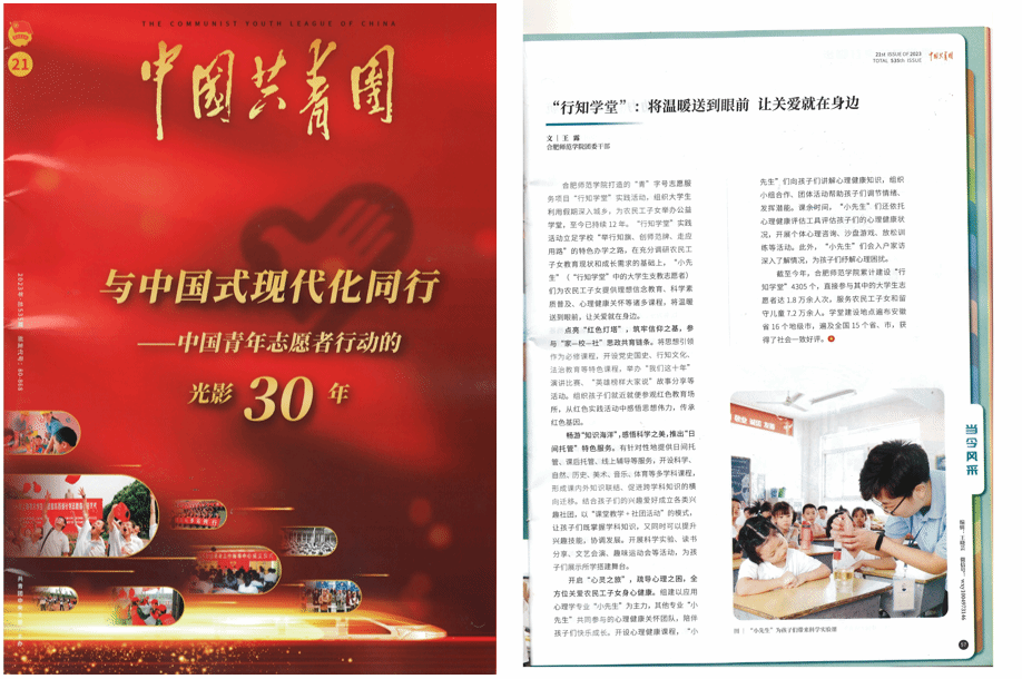 由共青团中央主办的《中国共青团》杂志在2023年第21期推出专刊《与中国式现代化同行——中国青年志愿者行动的光影30年》,在《志愿服务的青春脚步2010年5月》当今风采栏目中,以《“行知学堂”:将温暖送到眼前 让关爱就在身边》为题,用较大篇幅对我院“行知学堂”实践活动进行了全面报道和大力推介。报道围绕“点亮红色灯塔”“畅游知识海洋”“开启心灵之旅”三个方面,介绍了行知学堂开展思想政治引领、科学普及、心理辅导等特色课程,以及参与思政育人链条、推出“日间托管”服务、关爱农民工子女身心健康等方面的特色做法。这是《中国共青团》杂志第三次对我院进行报道,进一步凸显了“行知学堂”实践活动的品牌效应和社会影响力。(院团委)