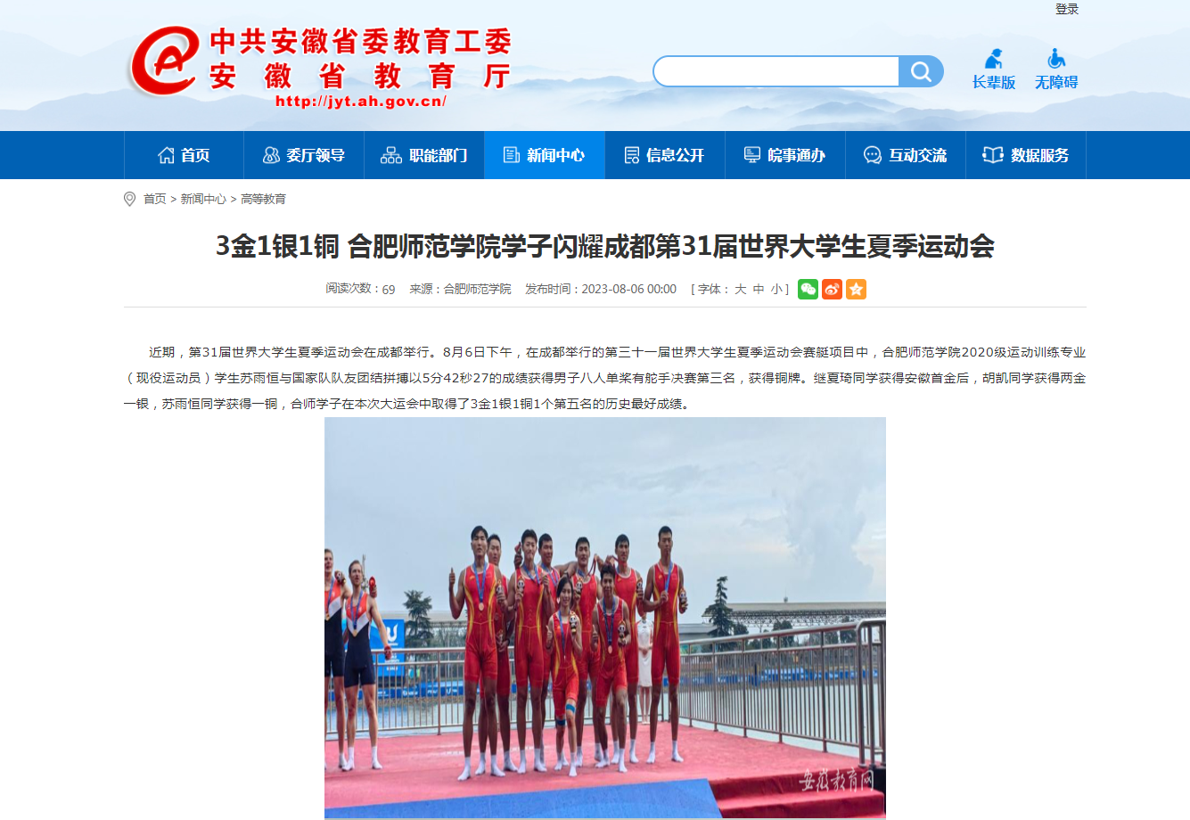 8月6日,安徽教育网首页以《3金1银1铜 388vip太阳集团学子闪耀成都第31届世界大学生夏季运动会》为标题,对此进行了报道。