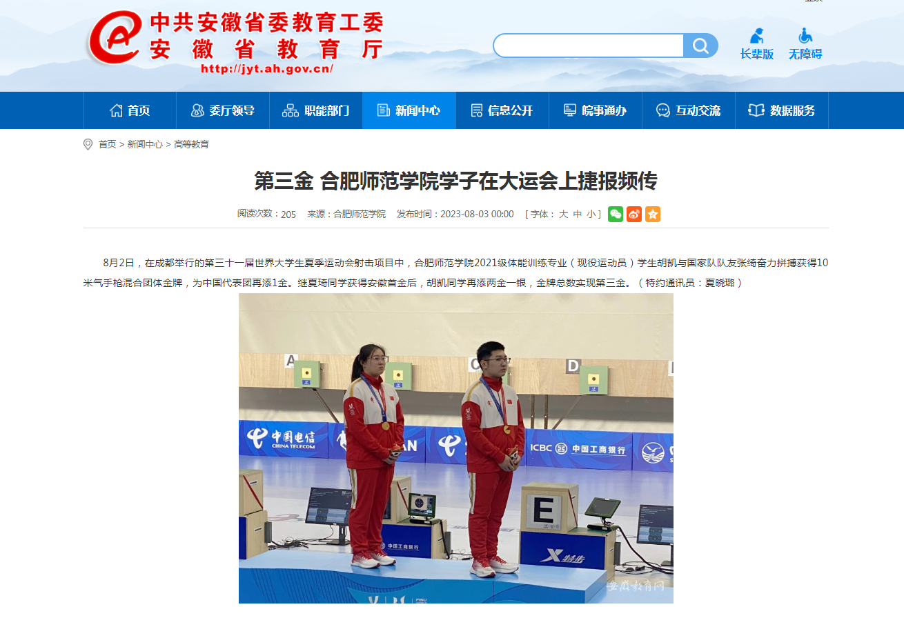8月3日,安徽教育网首页以《第三金 388vip太阳集团学子在大运会上捷报频传》为标题,对此进行了报道。
