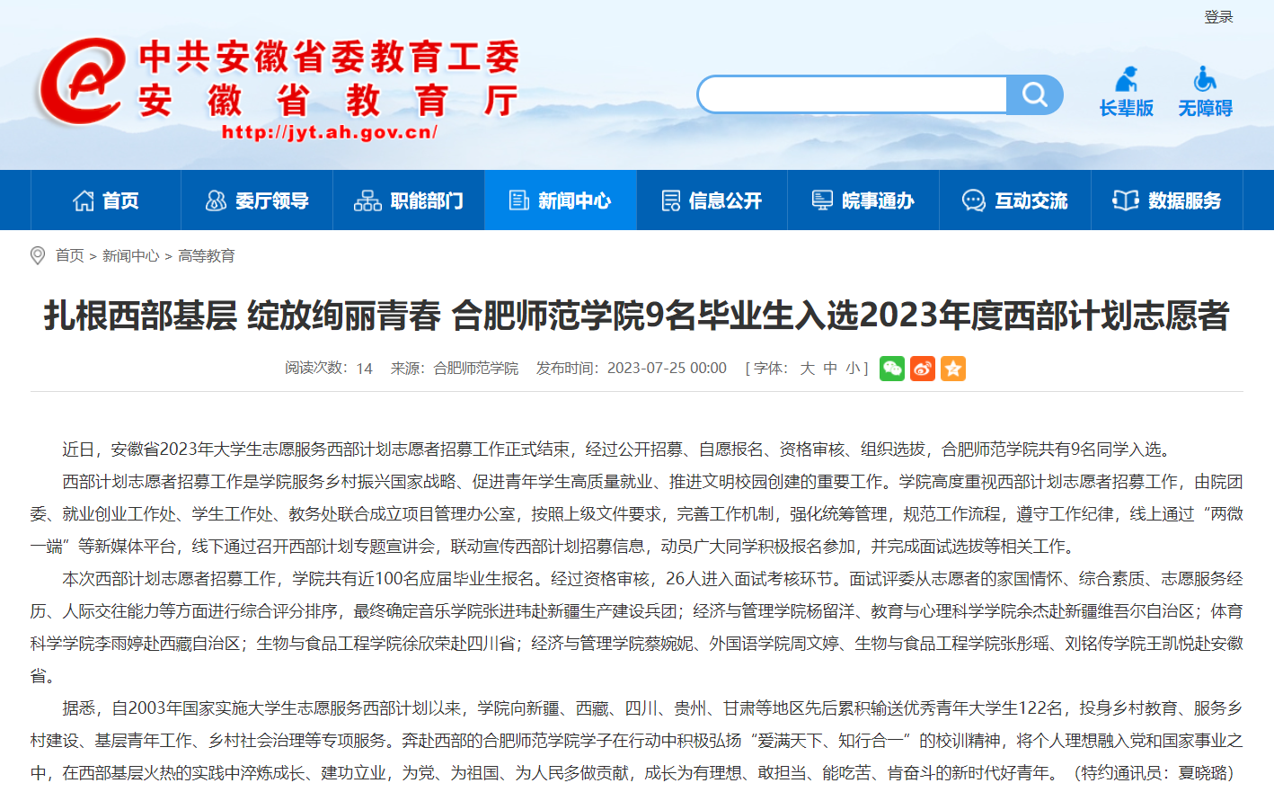 7月25日,安徽教育网首页以《扎根西部基层 绽放绚丽青春 388vip太阳集团9名毕业生入选2023年度西部计划志愿者》为标题,对此进行了报道。