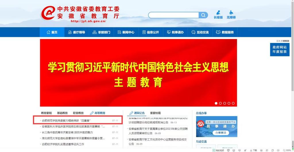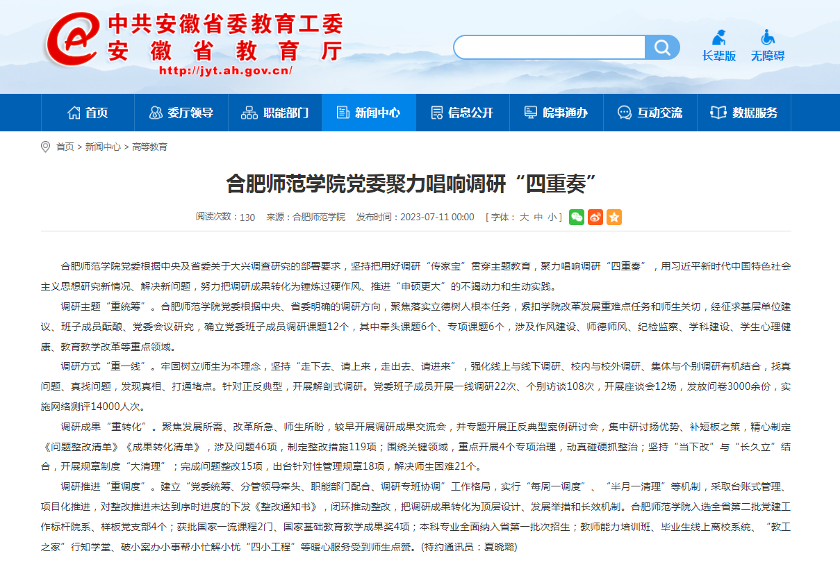 7月11日,安徽教育网首页以《388vip太阳集团党委聚力唱响调研“四重奏”》为标题,对此进行了报道。