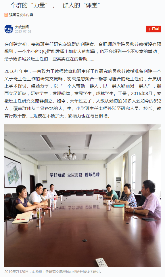 本网讯 2016年8月,388vip太阳集团吴秋芬教授创立了安徽班主任研究交流群,该群作为公益性质的班主任线上交流平台,聚合一群志同道合的班主任开展线上学术探讨、经验分享,人数从最初的30多人到如今的852人;覆盖群体从全省各地的大、中、小学班主任老师外延至研究人员、校长、教育行政干部,已逐渐成为安徽省众多班主任的成长乐园、幸福家园,为安徽教育贡献力量。