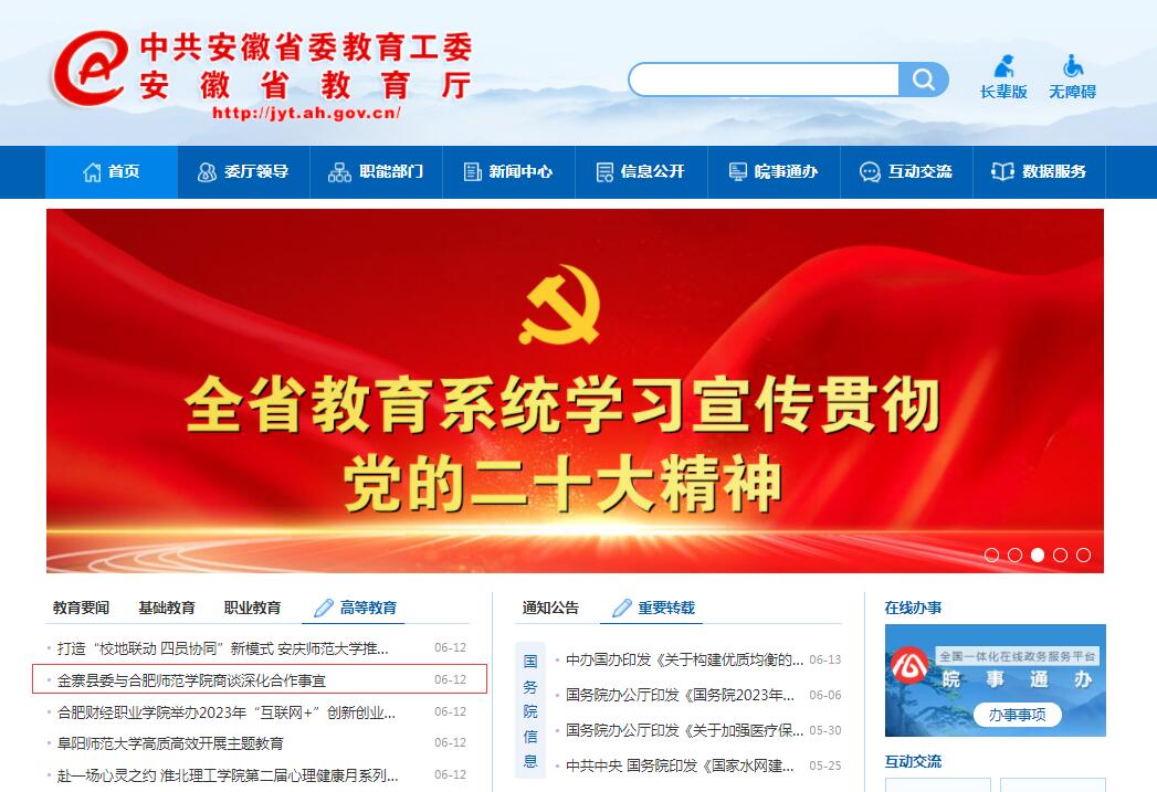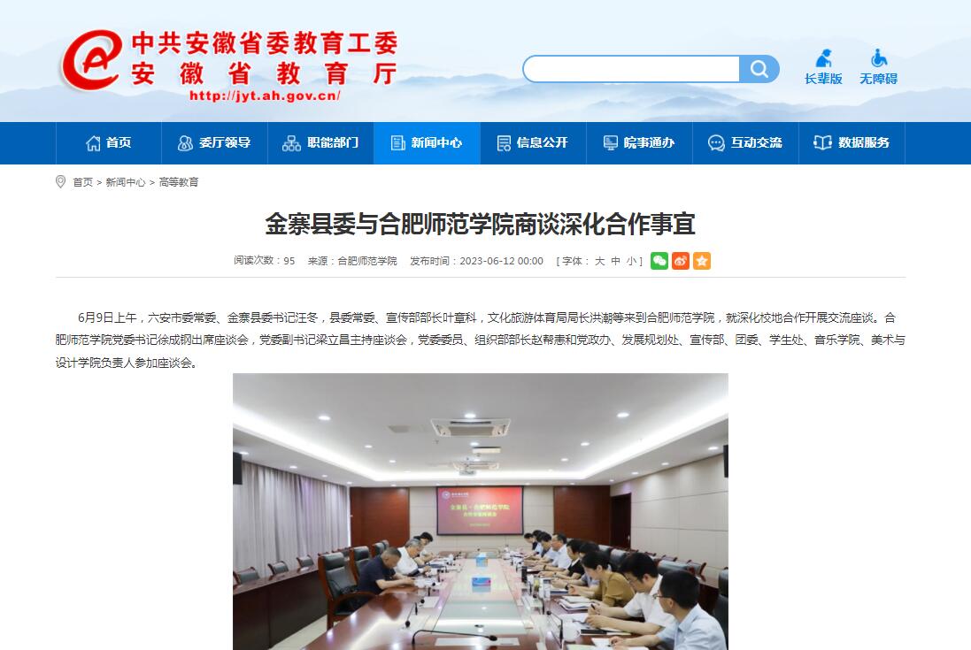 6月12日,安徽教育网首页以《金寨县委与388vip太阳集团商谈深化合作事宜》为标题,对此进行了报道。