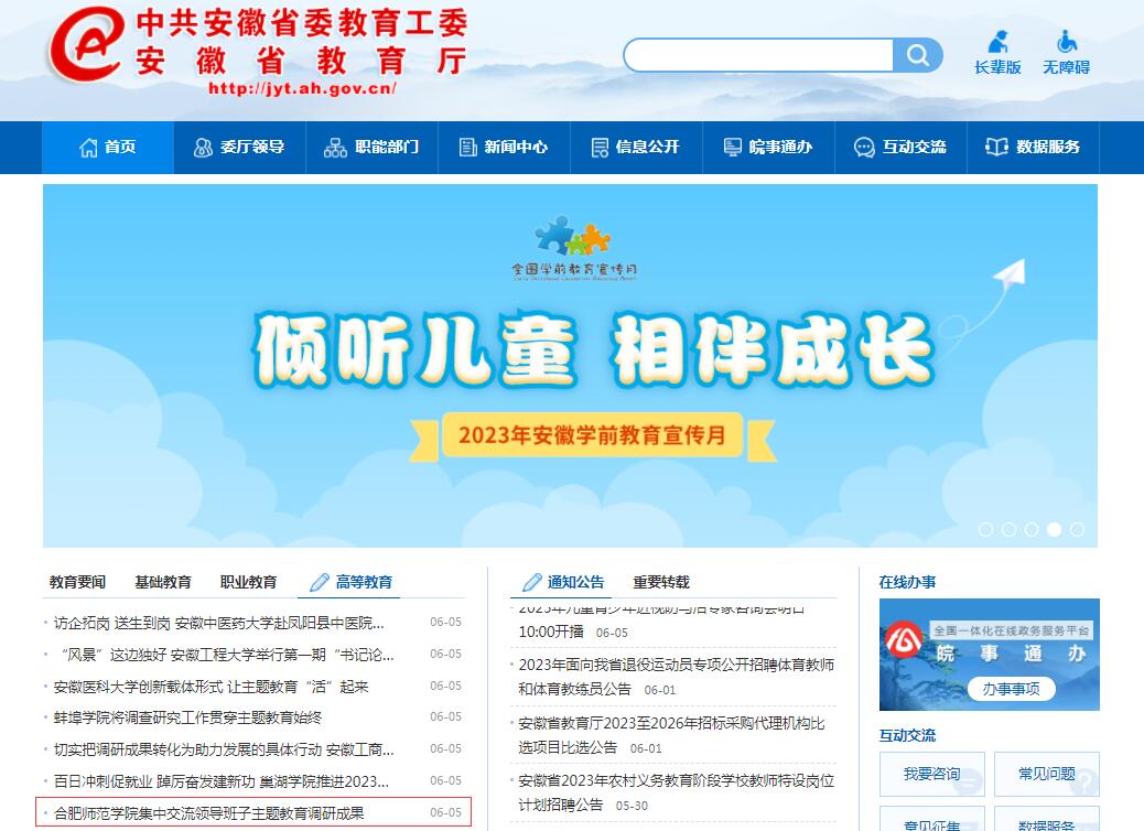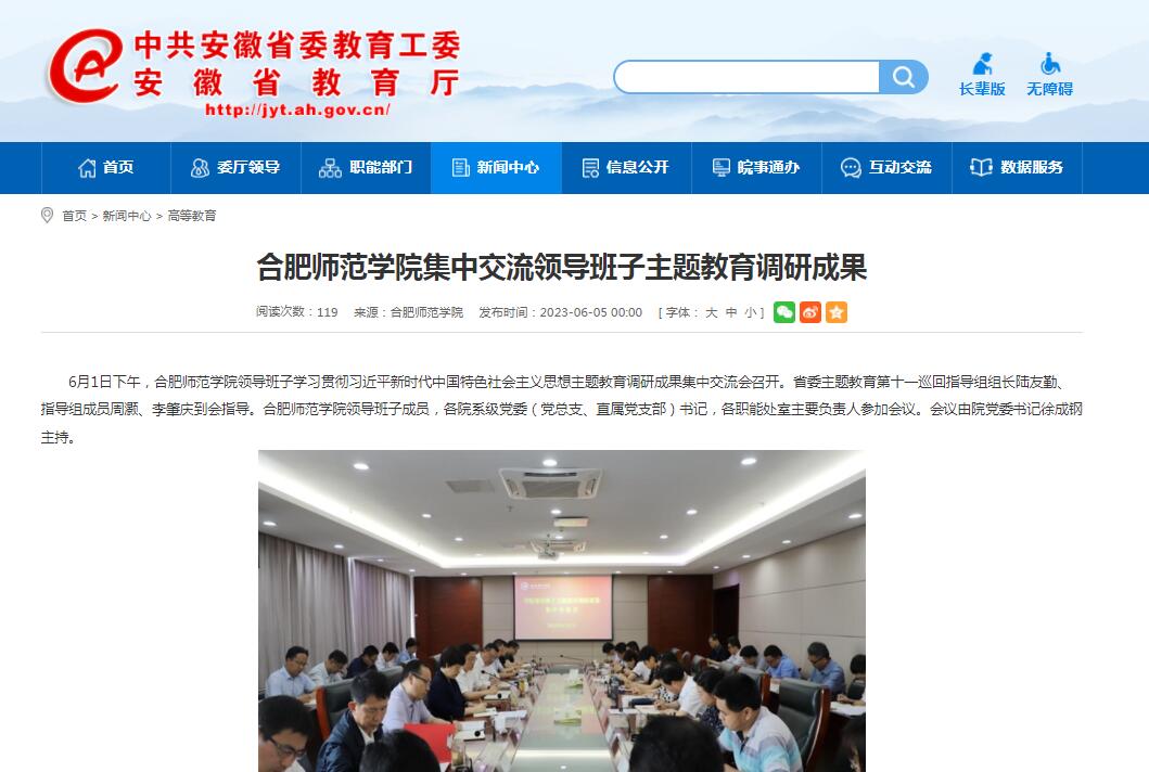 6月5日,安徽教育网首页以《388vip太阳集团集中交流领导班子主题教育调研成果》为标题,对此进行了报道。