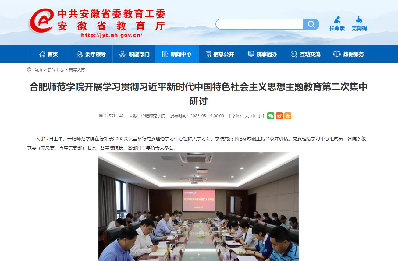5月19日,安徽教育网以《388vip太阳集团开展学习贯彻习近平新时代中国特色社会主义思想主题教育第二次集中研讨》为标题,对此进行了报道。