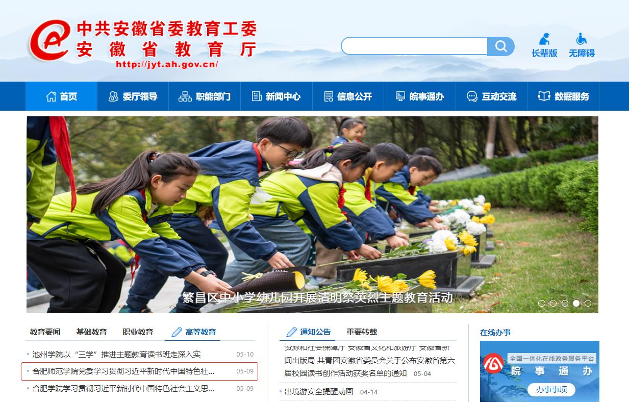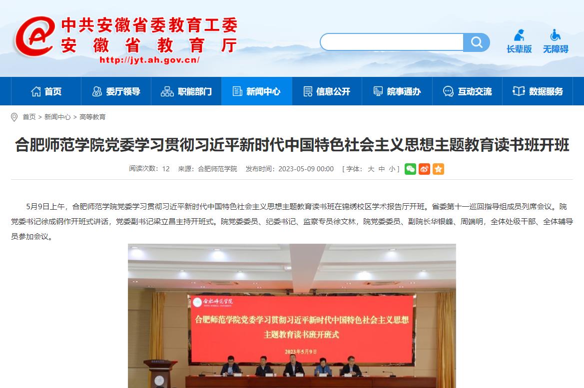 5月10日,安徽教育网首页以《388vip太阳集团党委学习贯彻习近平新时代中国特色社会主义思想主题教育读书班开班》为标题,对此进行了报道。