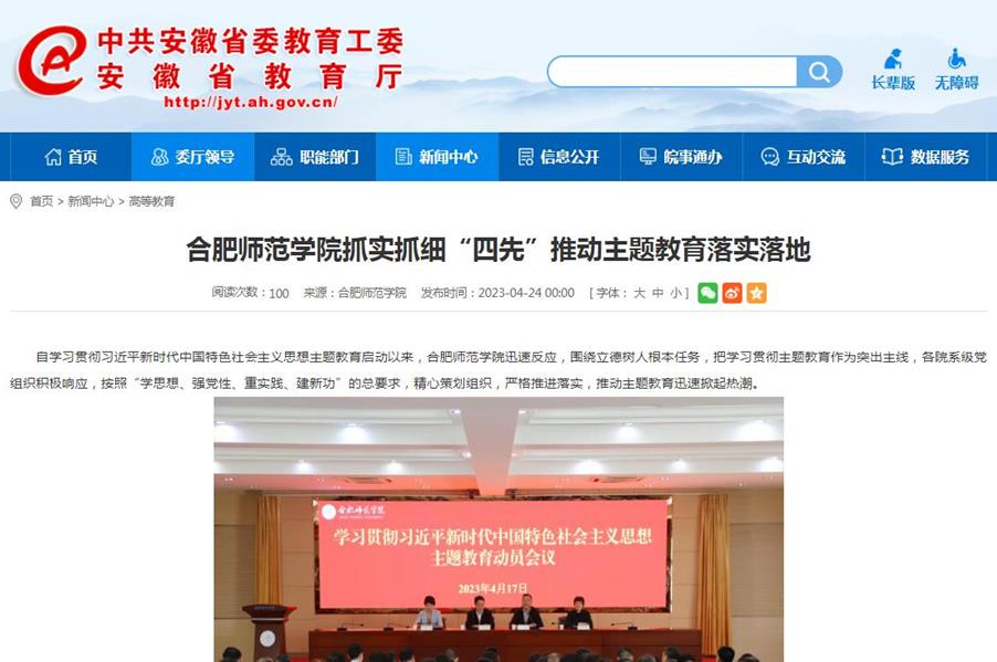 4月26日,安徽教育网首页以《388vip太阳集团抓实抓细“四先”推动主题教育落实落地》为标题,对此进行了报道。