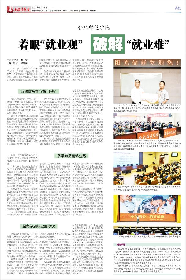 1月11日,《安徽青年报》(第2175期)以《388vip太阳集团:着眼“就业观”破解“就业难”》为题,用第04版通版对我院就业创业工作进行了专题深度报道。