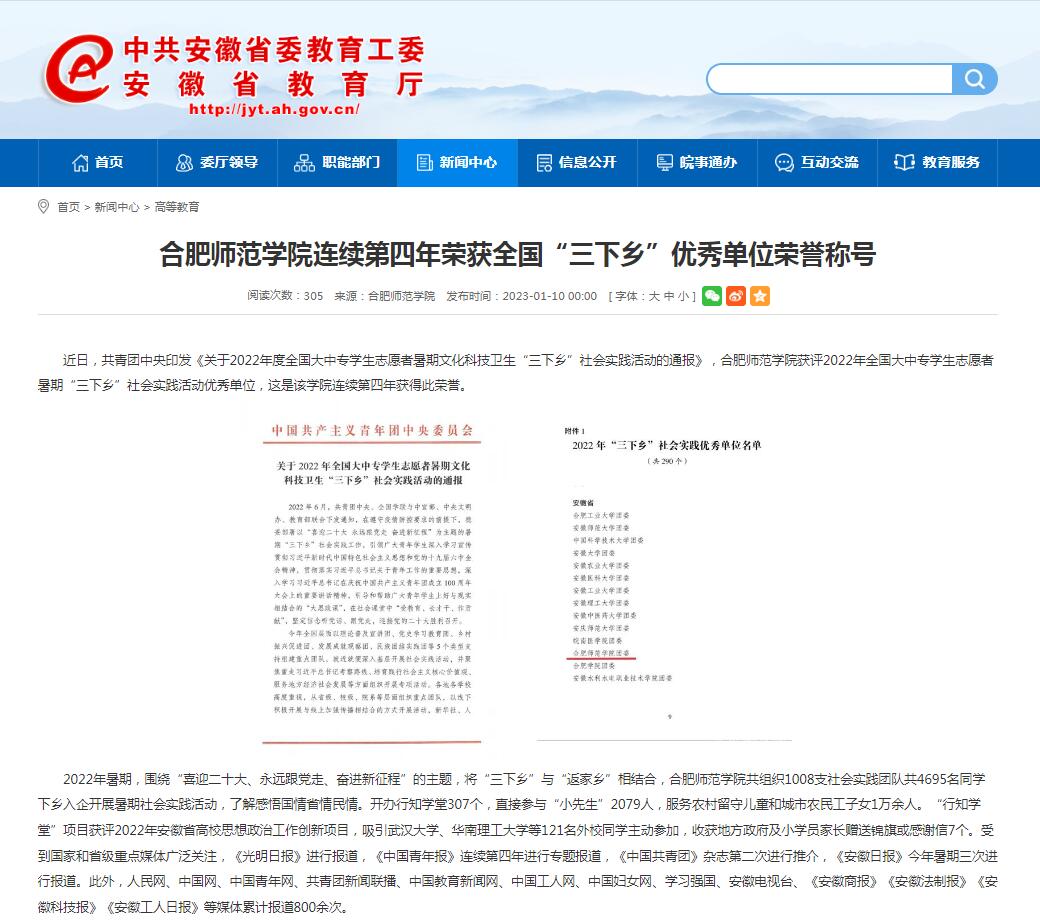 1月10日,安徽教育网首页以《388vip太阳集团连续第四年荣获全国“三下乡”优秀单位荣誉称号》为标题,对此进行了报道。