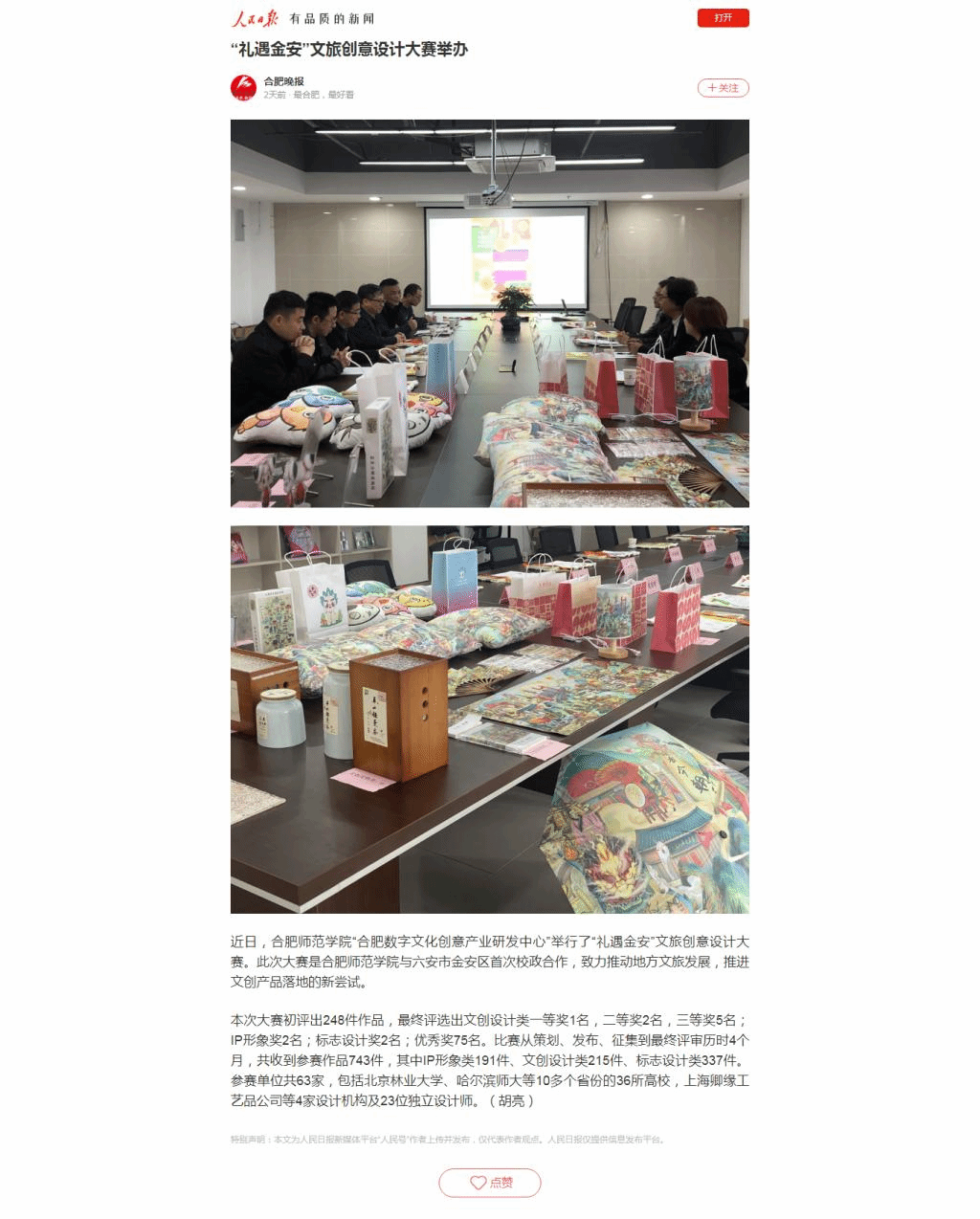 人民日报客户端对学院“礼遇金安”文旅创意设计大赛进行了报道。(艺术传媒学院)