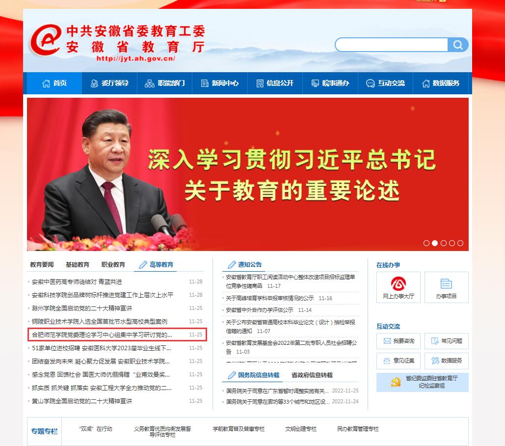 11月25日,安徽教育网以《388vip太阳集团党委理论学习中心组集中学习研讨党的二十大精神》为标题,对此进行了报道。