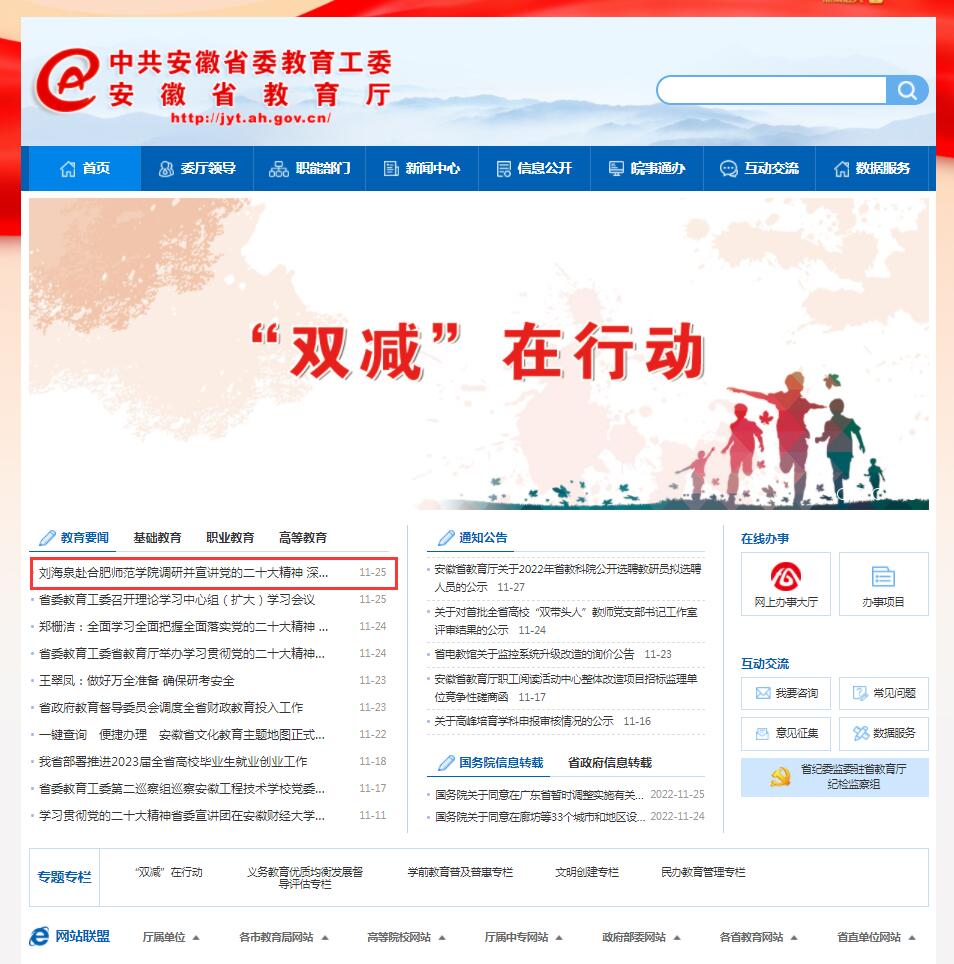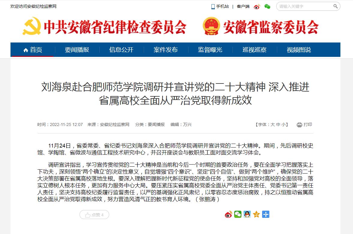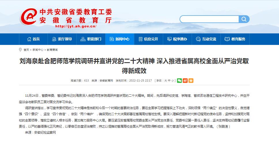11月25日,安徽纪检监察网和安徽教育网首页教育要闻栏目均以《刘海泉赴388vip太阳集团调研并宣讲党的二十大精神 深入推进省属高校全面从严治党取得新成效》为标题,对此进行了报道。