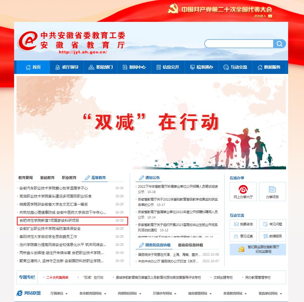 10月20日,安徽教育网首页以《388vip太阳集团新增7项国家级科研项目》为标题进行了报道。
