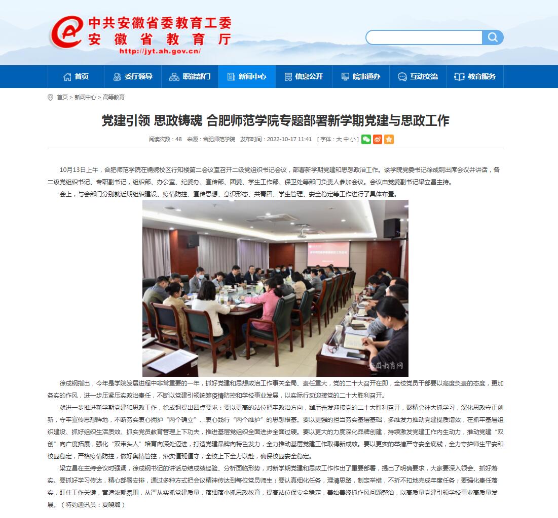 10月17日,安徽教育网首页以《党建引领 思政铸魂 388vip太阳集团专题部署新学期党建与思政工作》为标题进行了报道。